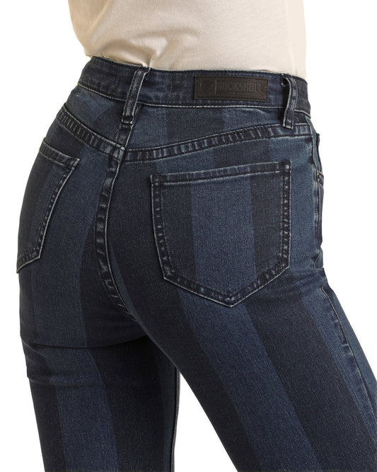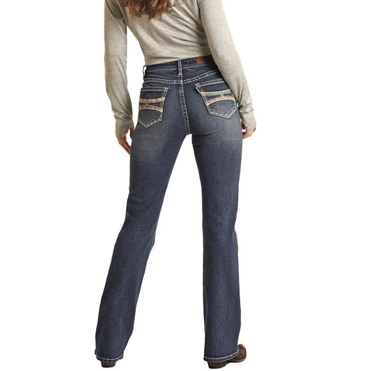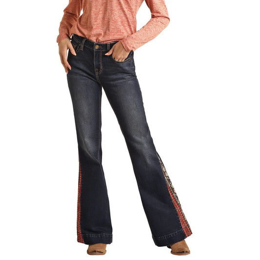 Rock & Roll Hooey Women's Mid Rise Extra Stretch Jeans - Dark Wash Aztec Insert Flares