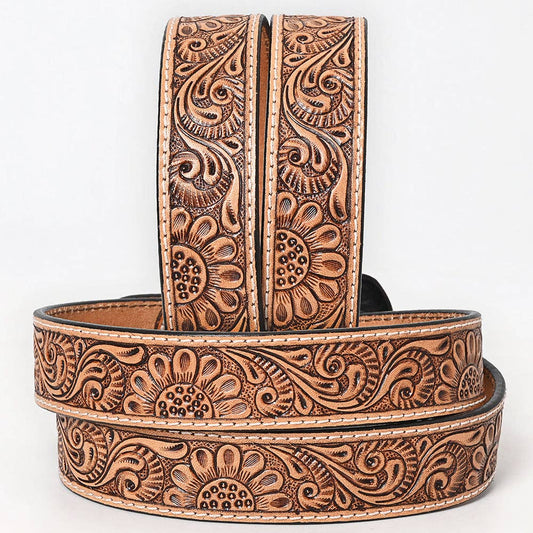 Genuine Tooled Leather Belt with Silver Removable Buckle