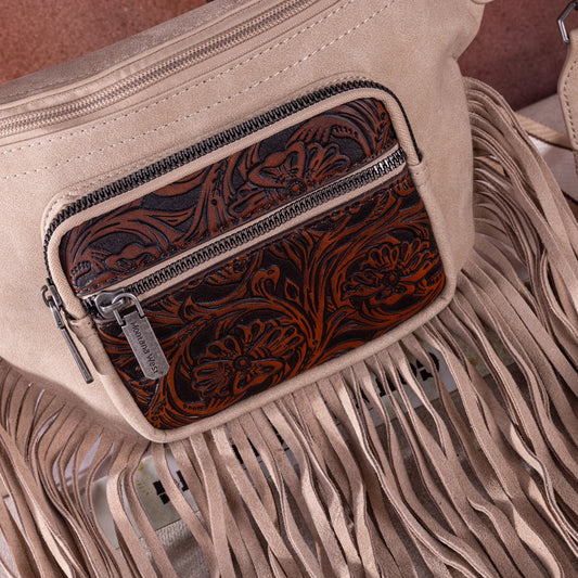Montana West Floral Tooled Fringe Fanny Pack - Tan