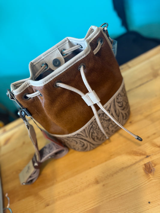 Montana West Cowhide Tooled Bucket Shoulder/Crossbody Bag - Tan
