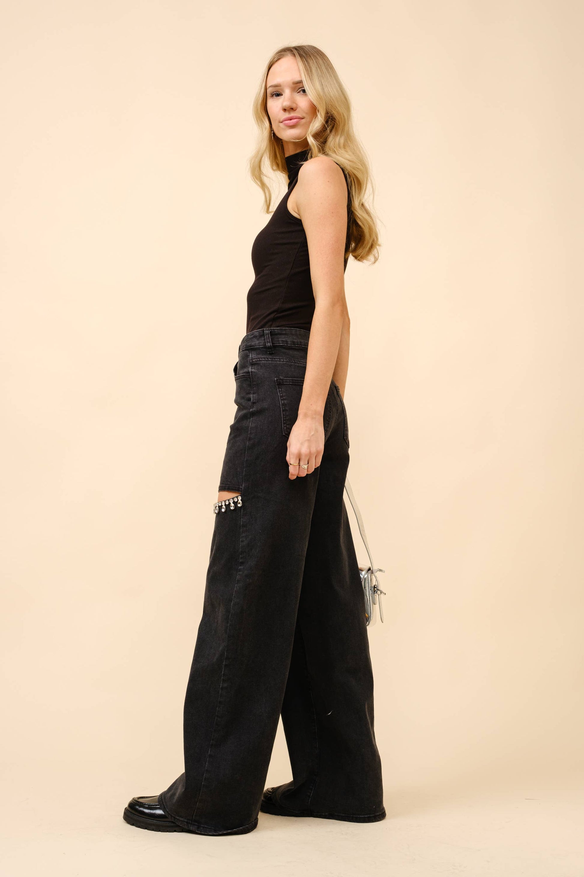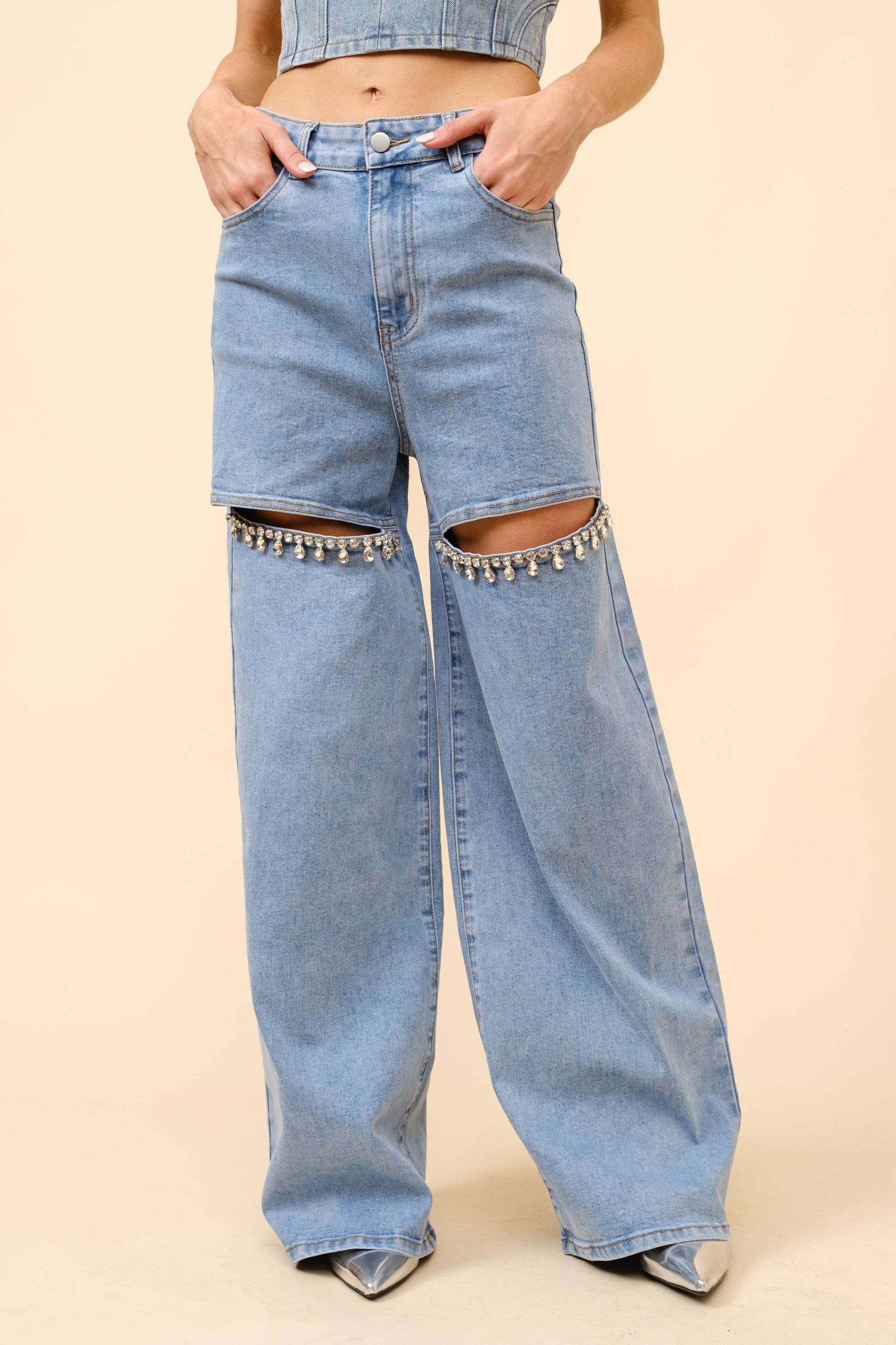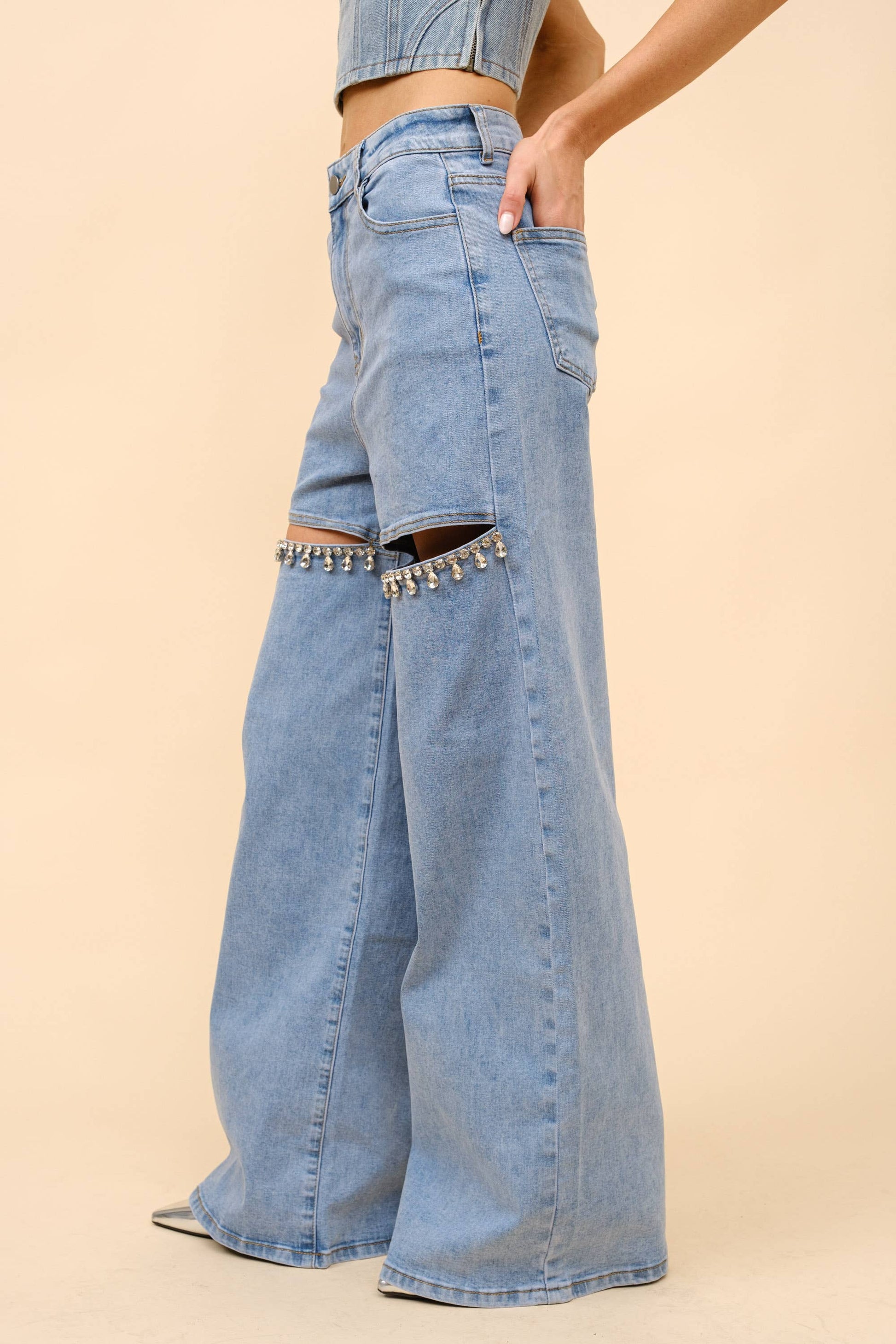 Glistening crystals encircling slit cutouts on wide-leg jeans sewn from stretch denim. 75% Cotton 23% Polyester 2% Spandex
