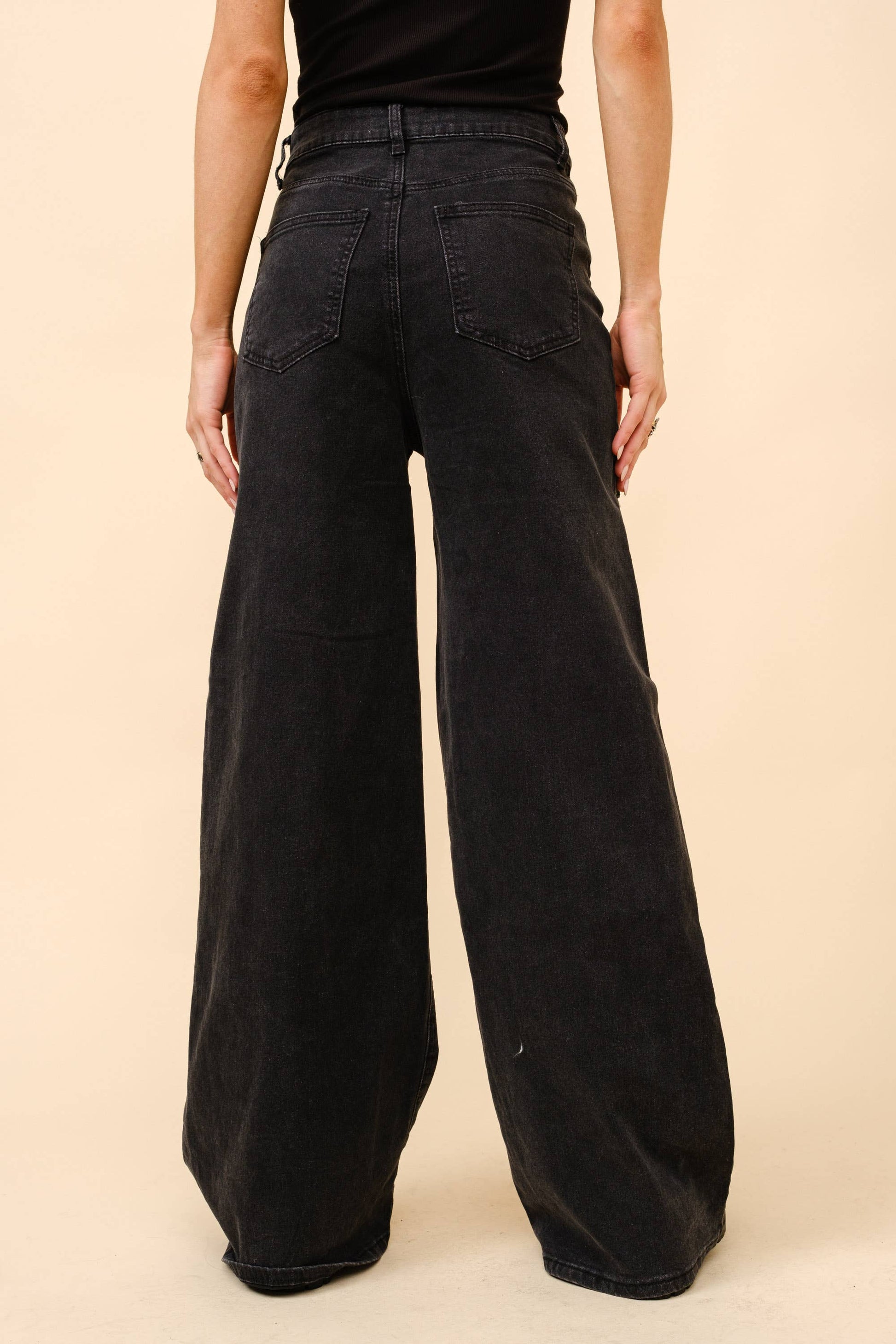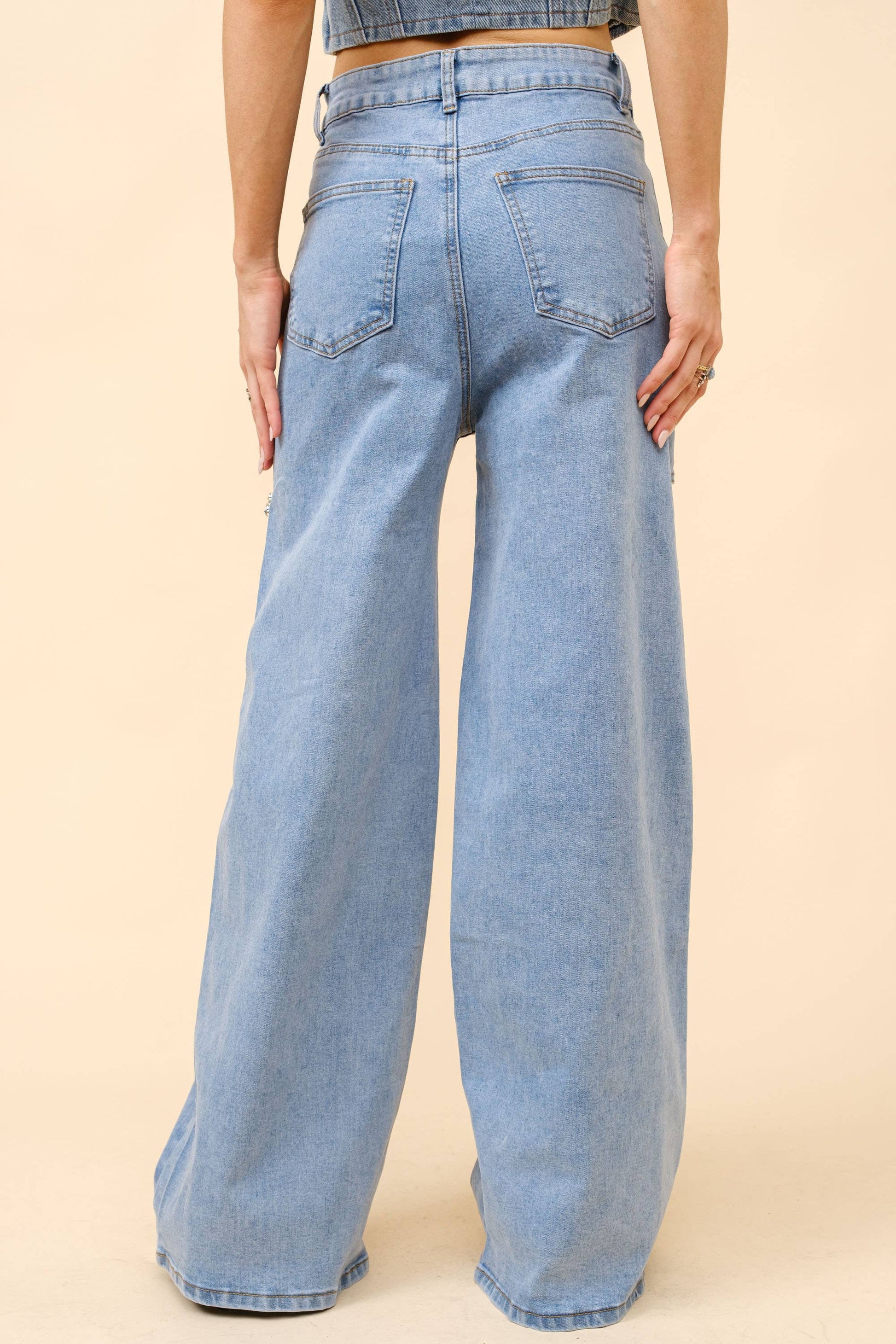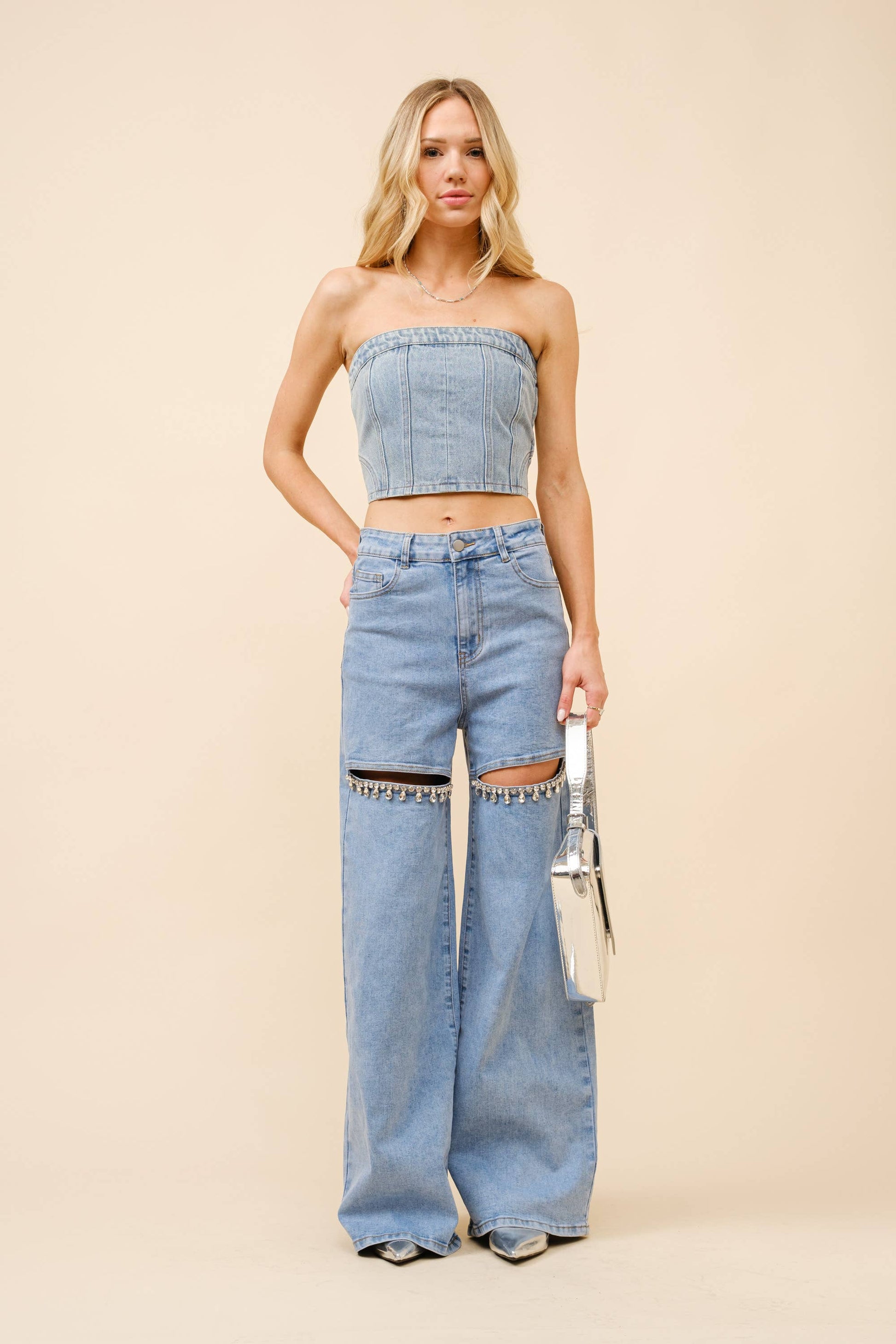 Glistening crystals encircling slit cutouts on wide-leg jeans sewn from stretch denim. 75% Cotton 23% Polyester 2% Spandex