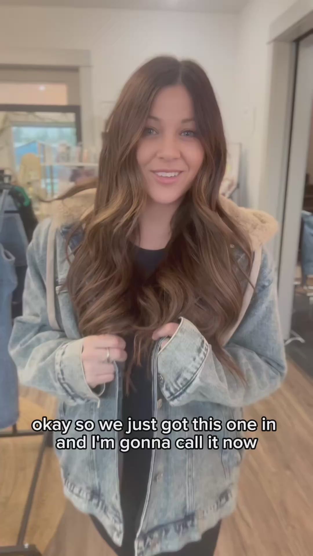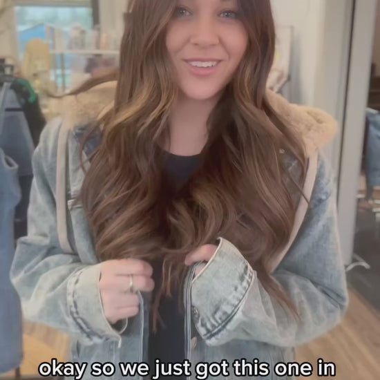 Stay warm in timeless style with the Blue Ridge Sherpa Denim Jacket. Crafted from classic blue denim, this jacket is fully lined with soft tan faux fur that extends through the hood for extra warmth and comfort. A button-front closure, chest pockets, and oversized lower pockets give it a true denim-jacket feel, while the plush sherpa lining adds a cozy, cold-weather upgrade. Finished with a drawstring hood for adjustable coverage, this piece is perfect for layering over your everyday basics for an effortlessly cool, laid-back look.