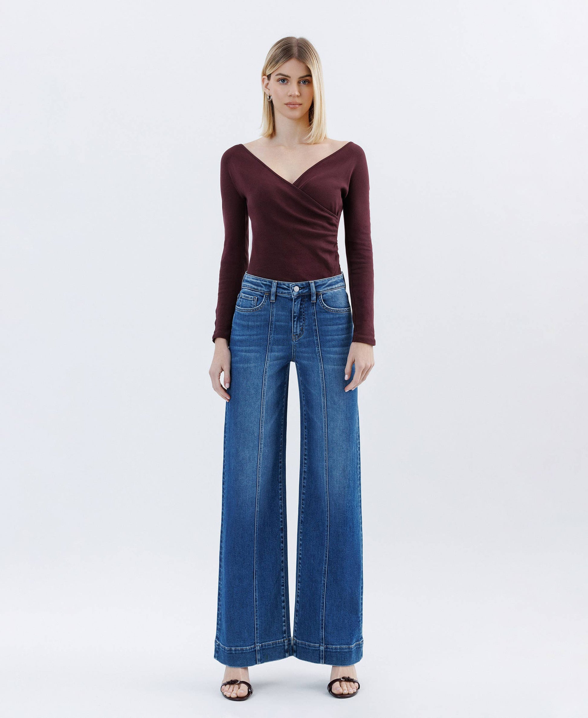 Meet your new go-to statement jeans. The High Life Wide Leg Flare Jeans by Flying Monkey feature an ultra-flattering high rise and an extreme wide leg silhouette that gives effortless, laid-back cool with a polished edge. Designed in comfort stretch denim, these jeans hold their shape while offering all-day wearability. The trouser-style hem elevates the look, making them just as easy to dress up with heels as they are to wear casually with boots or sneakers. Finished in a classic dark wash, this pair is timeless, flattering, and made to stand out.