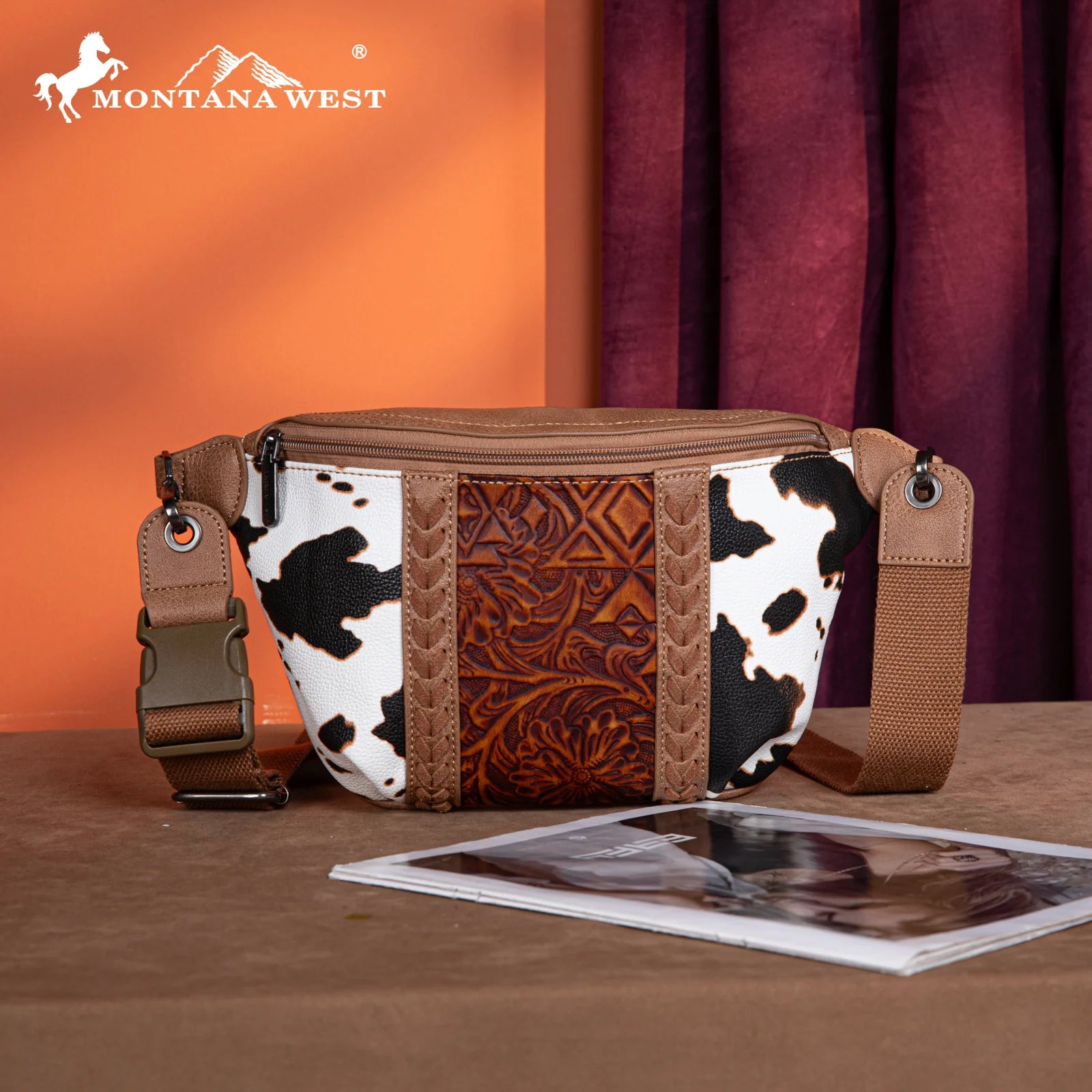 Add bold Western flair to your on-the-go style with the Montana West Tooled Collection Fanny Pack in Brown. Crafted from durable PU leather, this standout accessory features a beautifully tooled floral design paired with striking cow-print accents, creating a perfect blend of classic Western artistry and modern trend appeal. Whipstitch detailing adds the finishing touch to its rugged charm.