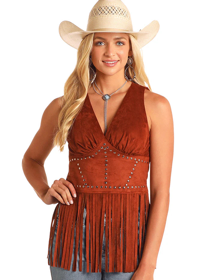 Rock & Roll Denim BW20T05873 Womens Studded Microsuede Fringe Top Brown