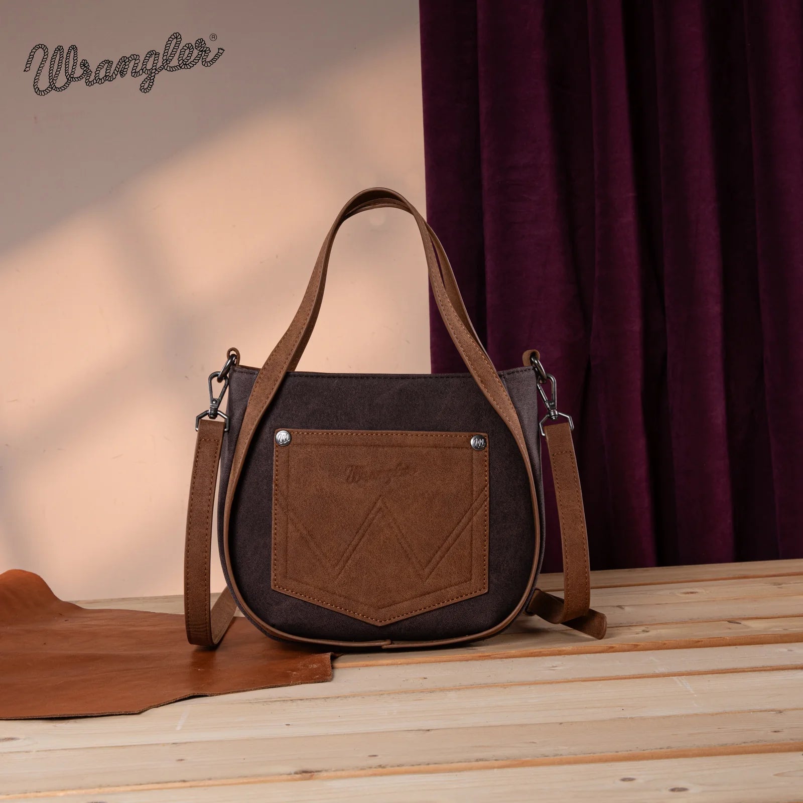 Designed with striking two-tone contrast and signature W-shaped stitching, this standout piece features a Wrangler logo applique and dramatic front fringe for an unmistakably Western look.